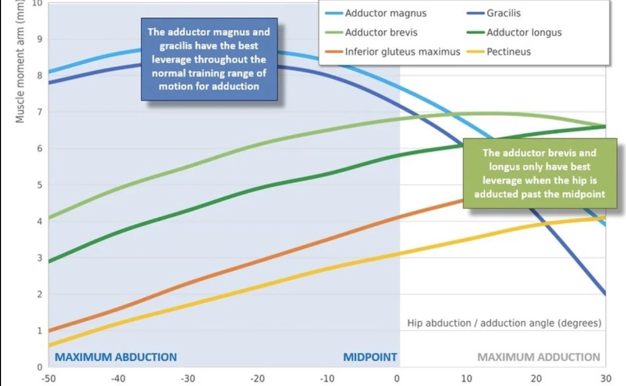 The adductor magnus has the best adduction leverage from anatomical position (neutral) moving out into maximum hip abduction. The gracilis tracks the adductor magnus closely with this activation pattern. However, the adductor magnus loses adduction leverage during deeper hip flexion and has greater leverage to adduct in extension. For example: more activation of magnus in a copenhagen plank vs seated hip adduction machine with the hip flexed to 90 degrees.
